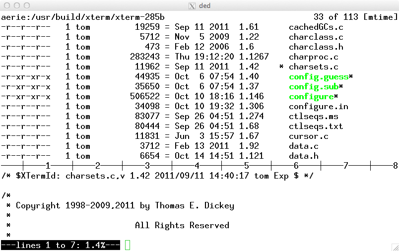 ded (pronounced "dee–eee–dee") allows you to navigate through multiple file lists or a directory tree, viewing or changing file attributes rapidly. In addition to conventional file information, it operates on the file's RCS or SCCS archives (or CVS or SVN, etc), making it useful for source-control as well as system administration. Curses-based, it runs on UNIX systems.