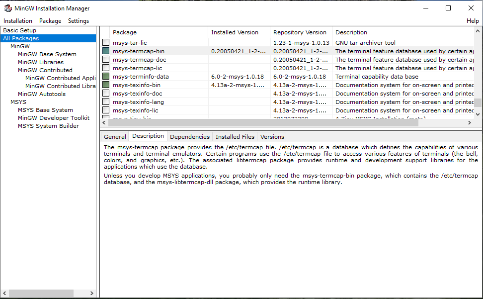 $ mingw-ldd libncursesw6.dll libncursesw6.dll +- KERNEL32.dll +- msvcrt.dll +- USER32.dll +- libgcc_s_dw2-1.dll