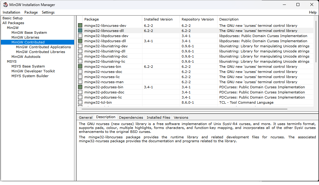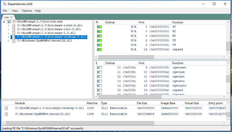 $ mingw-ldd libncursesw6.dll libncursesw6.dll +- KERNEL32.dll +- msvcrt.dll +- USER32.dll