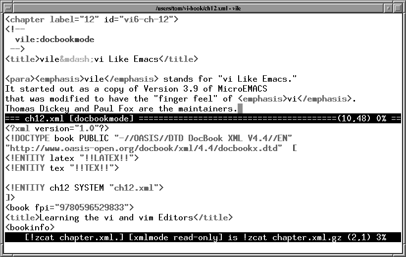 The split screen is the result of typing vile ch12.xml followed by :split and :e !zcat chapter.xml.gz.