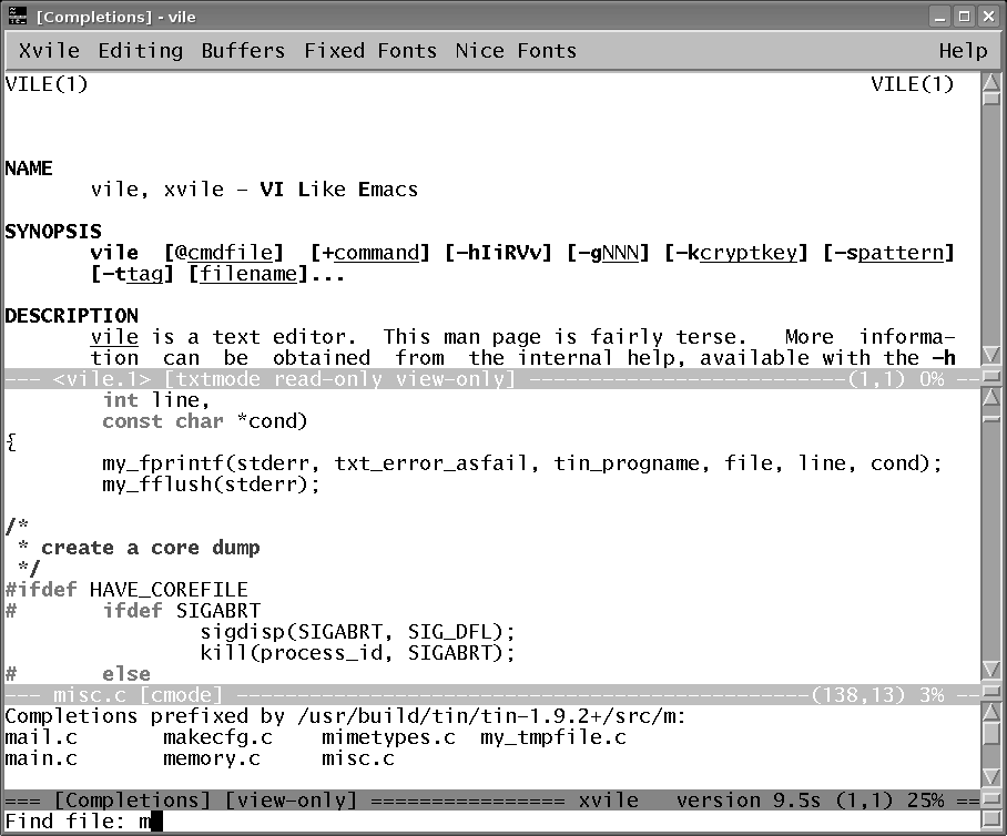 A three-line pane, which is active (noted by a darker status line), named [Completions], for filename completions. The pane is coordinated with the minibuffer (the colon command line): the first line reads Completions prefixed by /tmp/m:, and the minibuffer reads Find file: m. The rest of the pane contains the actual filenames which match. The first line of [Completions] and the contents change as the user completes the filename (and presses TAB to tell vile to show the reduced set of choices).