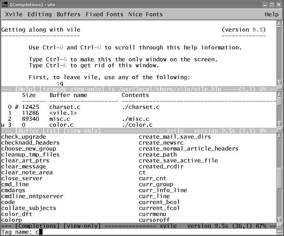 The [Completions] buffer is active. This time it displays tag completions for the partial match co, and the Completions prefixed message is not shown because the buffer is scrolled down, which is another side effect of pressing TAB: vile cycles through a scrolling action so that all of the choices will be shown even when the window is small. [5]