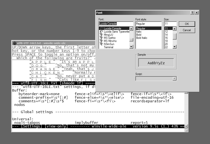 Figure 12.5 shows the result of selecting a more capable font. If you select the system font again, winvile will show the hexadecimal values again. If you prefer to see the wide characters as hexadecimal all the time, vile has an option setting for this purpose.