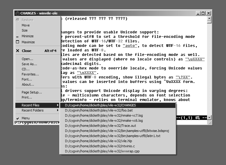 The menus provide the open-, save-, print-, font-operations typical of GUI applications. You can also set winvile's current working directory with the CD entry.