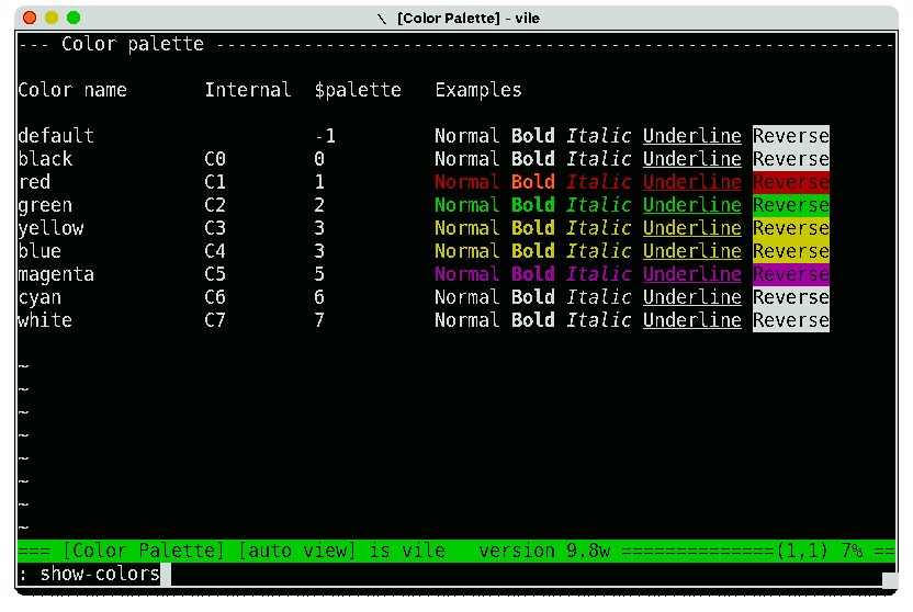 Because vile's keyword syntax highlighter automatically colors the class names with their defined color, it is easy to see the effect of changing a color definition.