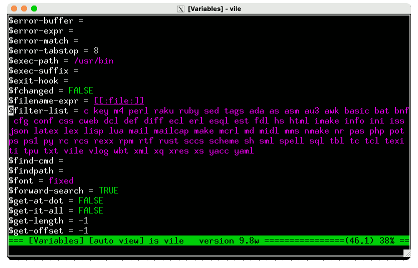 Vile uses the tables in various ways, including showing the available commands, providing name-completion, lists of predefined variables, functions used for scripting, etc. In other flavors of “vi”, tables like this are an integral part of the hand-crafted code—requiring their developers to do much of the busy-work which mktbls does.