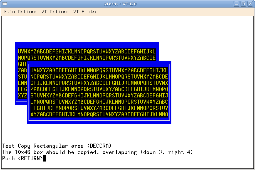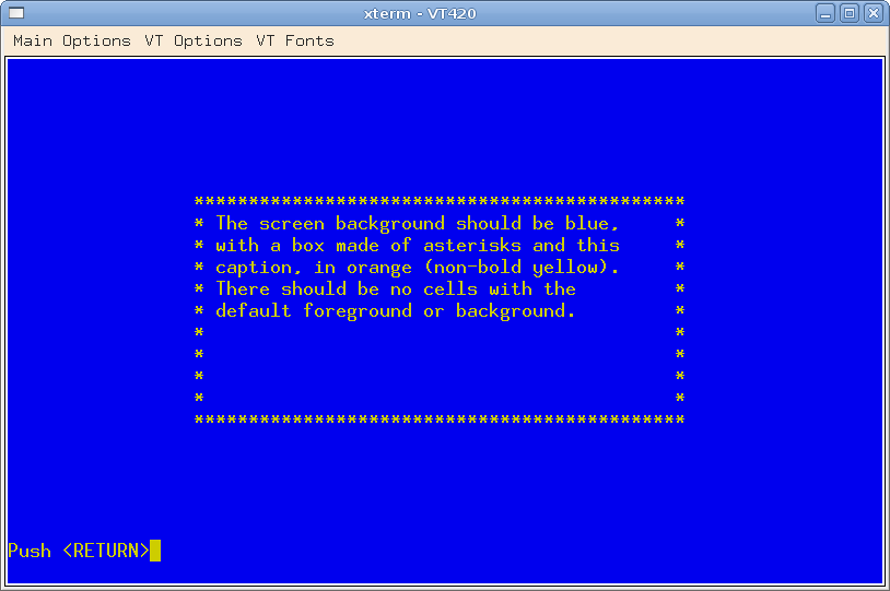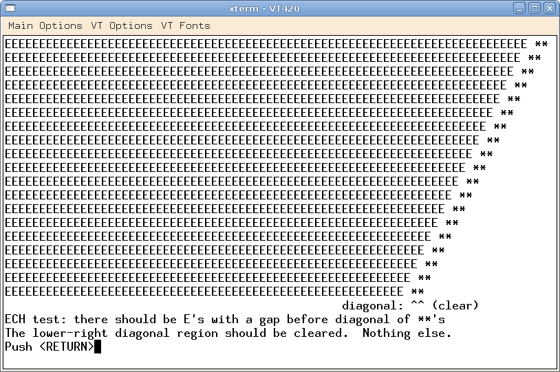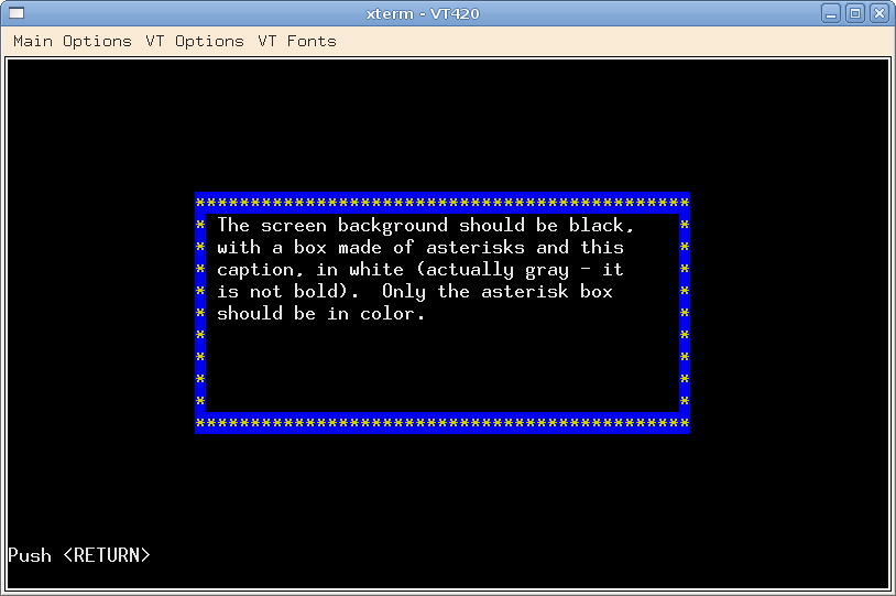 My original motivation for working on vttest was to provide a way to test the color changes I was making for xterm. Drawing colored text is straightforward. Drawing colored backgrounds presents many choices. For instance: