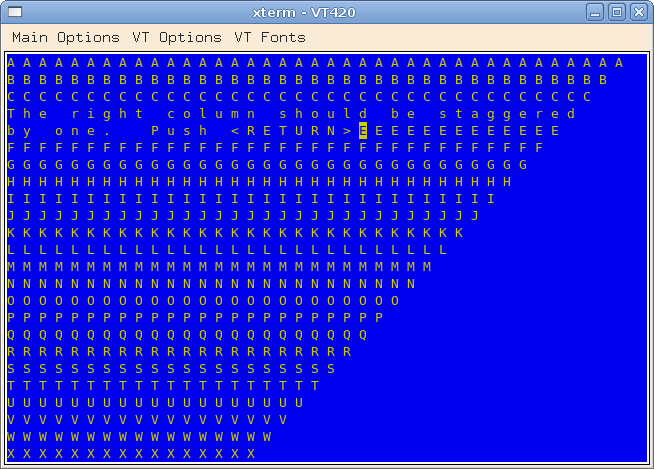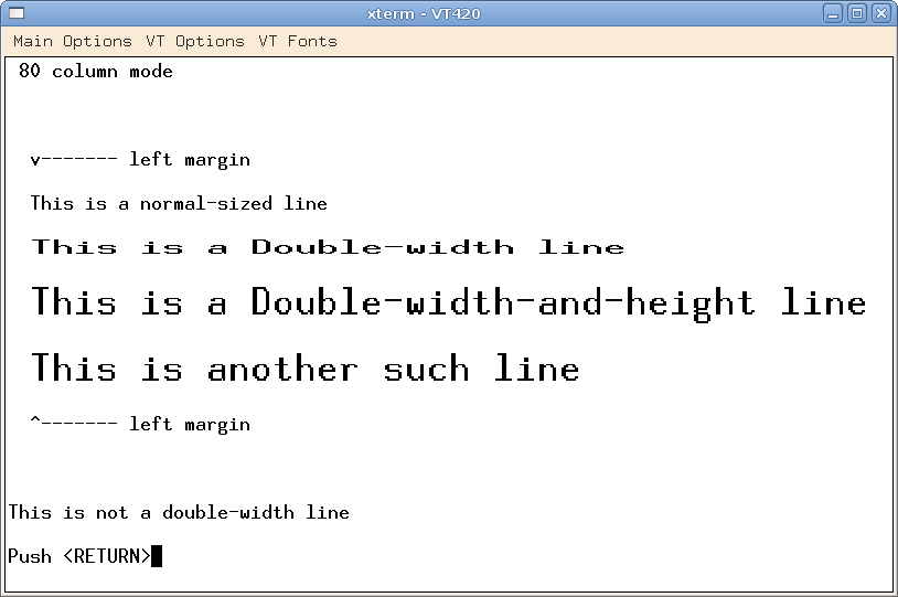 Double-sized characters required some work on xterm. Initially, it only drew normal sized characters with spaces in between (and there were a few issues to resolve). Xterm now draws double-sized characters using scaled fonts (a feature introduced by XFree86). Here is an example from the VT100 tests: