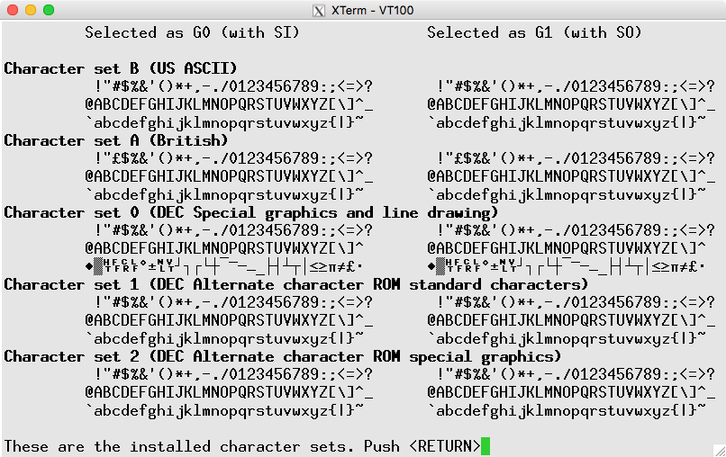 After I had been working on vttest for a while, I realized that xterm had features (other than the obvious case of function keys) that were not found in a VT100. These control sequences switch to a different character set for just one character (a single shift) or until undone (locking shifts). The VT100 line-drawing characters are a special case of the latter.