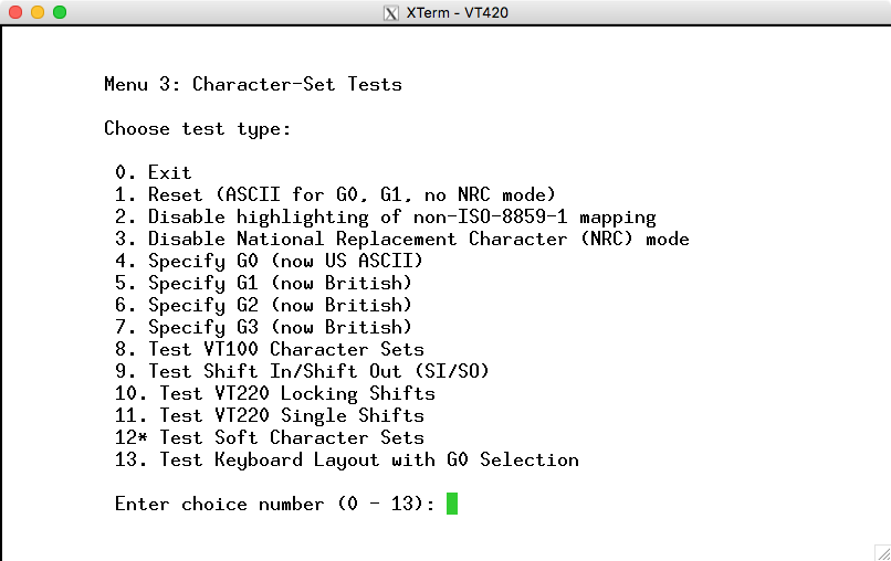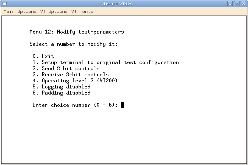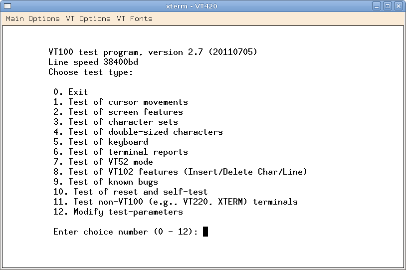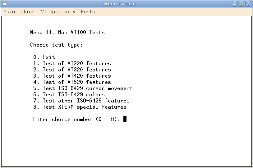 Vttest tests the compatibility (demonstrates the non-compatibility) of so-called “VT100-compatible” terminals. In conformance of the good old hacker traditions, the only documentation of this program is the source code itself. To understand it, you also need a copy of the original VT100 manual from DEC.