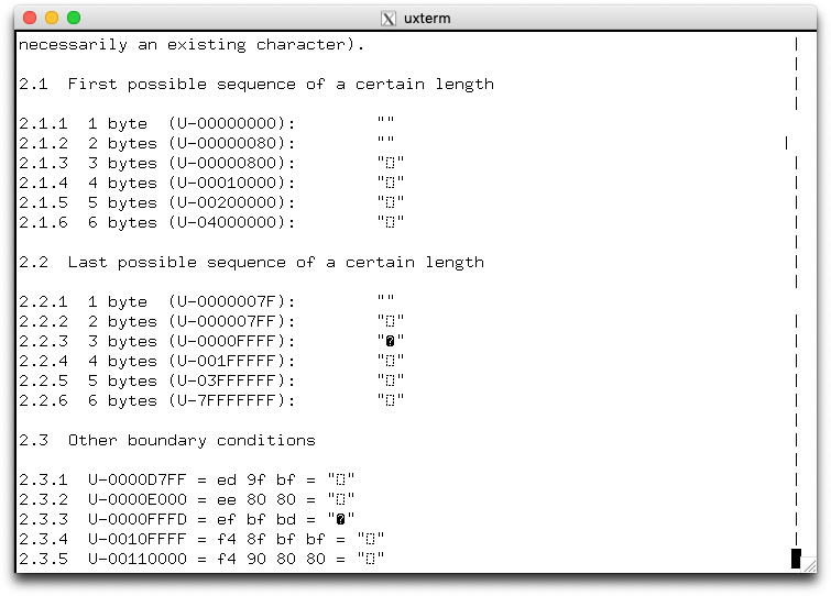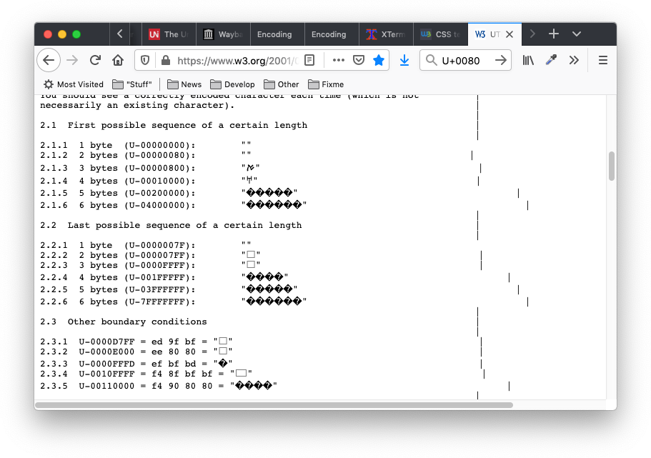 Comparing the results in a web browser was an issue to explore because Dan Gohman suggested changes to xterm's error handling would have it imitate Firefox (or equivalently, act like a terminal whose developers imitate Firefox). That was motivated by a comment in the Unicode chapter 3 on conformance: