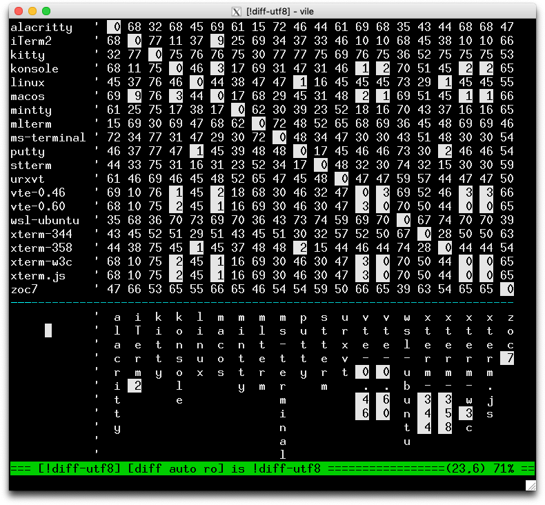 ** pairwise report .. level 0 xterm-w3c vs vte-0.60 xterm.js vs vte-0.60 xterm.js vs xterm-w3c .. level 1 putty vs linux (2.2.1) vte-0.46 vs konsole (2.1.2) vte-0.60 vs macos (2.1.2) xterm-358 vs linux (2.1.2) xterm-w3c vs macos (2.1.2) xterm.js vs macos (2.1.2) .. level 2 vte-0.46 vs macos (3.3.7, 3.4) vte-0.60 vs konsole (3.3.7, 3.4) xterm-358 vs putty (2.1.2, 2.2.1) xterm-w3c vs konsole (3.3.7, 3.4) xterm.js vs konsole (3.3.7, 3.4) .. level 3 macos vs konsole (2.1.2, 3.3.7, 3.4) vte-0.60 vs vte-0.46 (2.1.2, 3.3.7, 3.4) xterm-w3c vs vte-0.46 (2.1.2, 3.3.7, 3.4) xterm.js vs vte-0.46 (2.1.2, 3.3.7, 3.4) .. level 4 .. level 5 .. level 6 .. level 7 .. level 8 .. level 9 macos vs iTerm2 (2.2.1, 3.3.2, 3.3.3, 3.3.4, 3.3.5, 3.3.8, 3.3.9, 3.3.10, 3.4)
